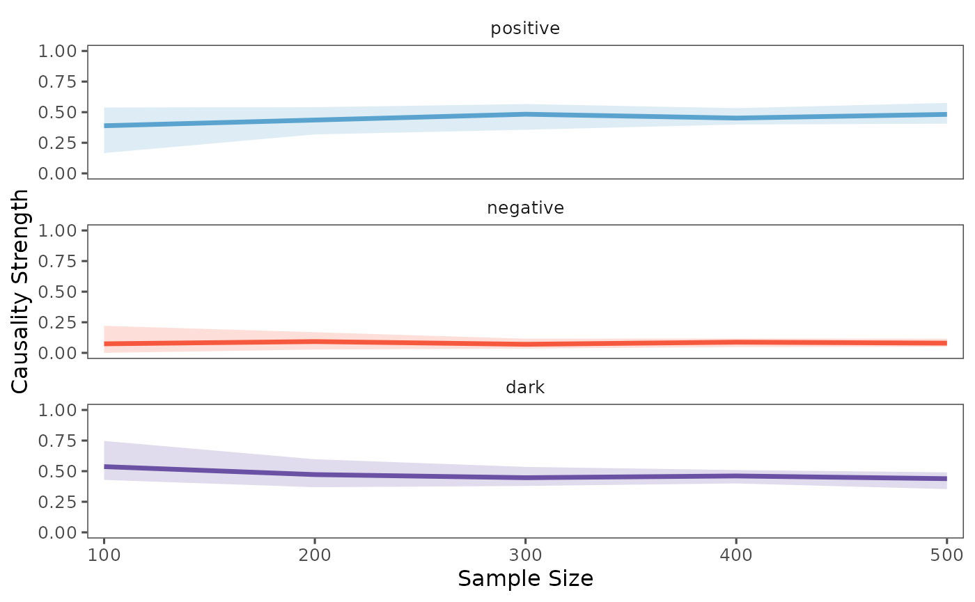 )The bootstrap analysis provides several statistical measures for each sample size: - Mean: Average causality measure across bootstrap samples - 5% and 95% quantiles: Confidence intervals for the causality measure - Median: Central tendency measure robust to outliers